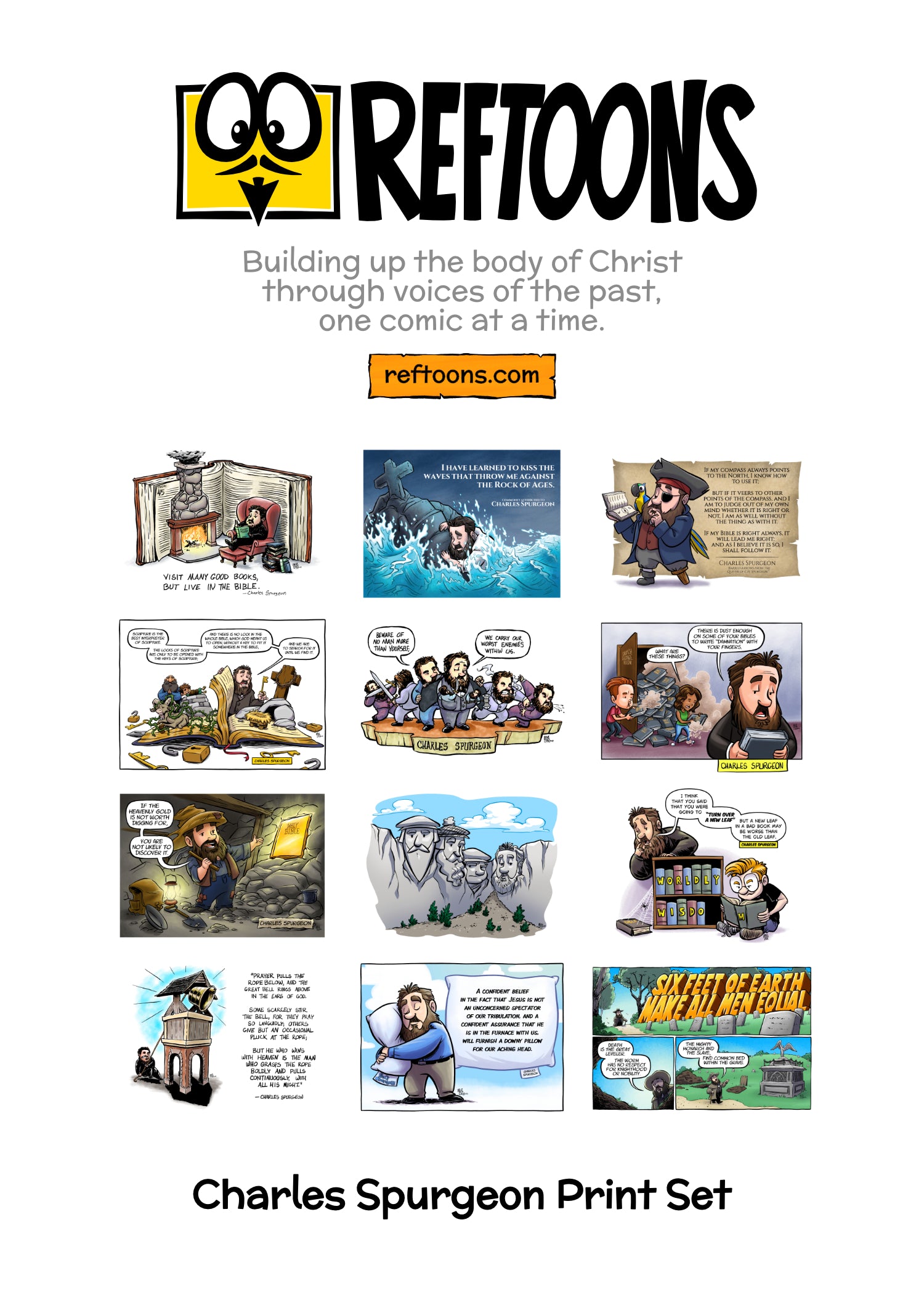 This collection 5x7 single-sided prints include twelve Charles Spurgeon toons. A perfect fit for our desk calendar stands.